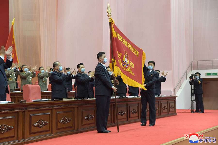 Upon authorization of the respected Comrade Kim Jong Un, general secretary of the Workers’ Party of Korea and president of the State Affairs of the Democratic People’s Republic of Korea, Ri Il Hwan, member of the Political Bureau and secretary of the Central Committee of the WPK, conferred the flag of the Socialist Patriotic Youth League.