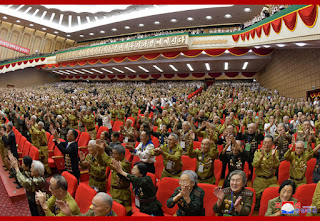 Amid the playing of the welcome music, Supreme Leader Kim Jong Un appeared at the platform of the conference with war veterans.