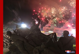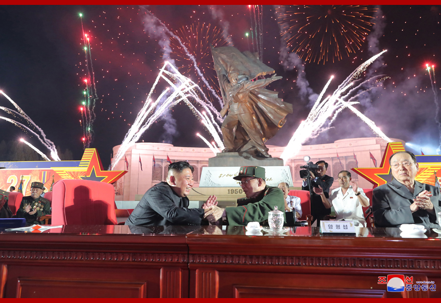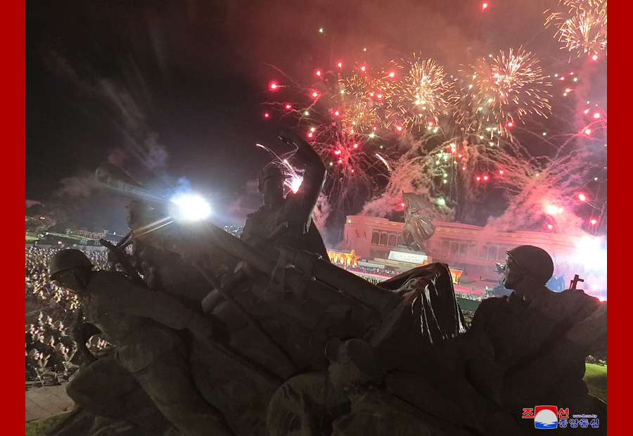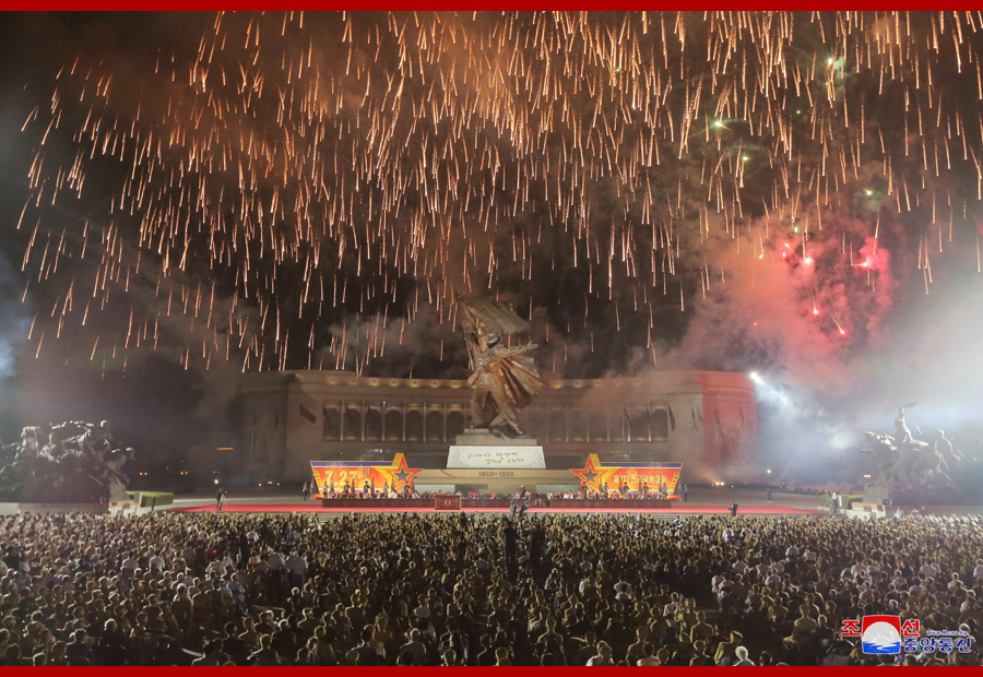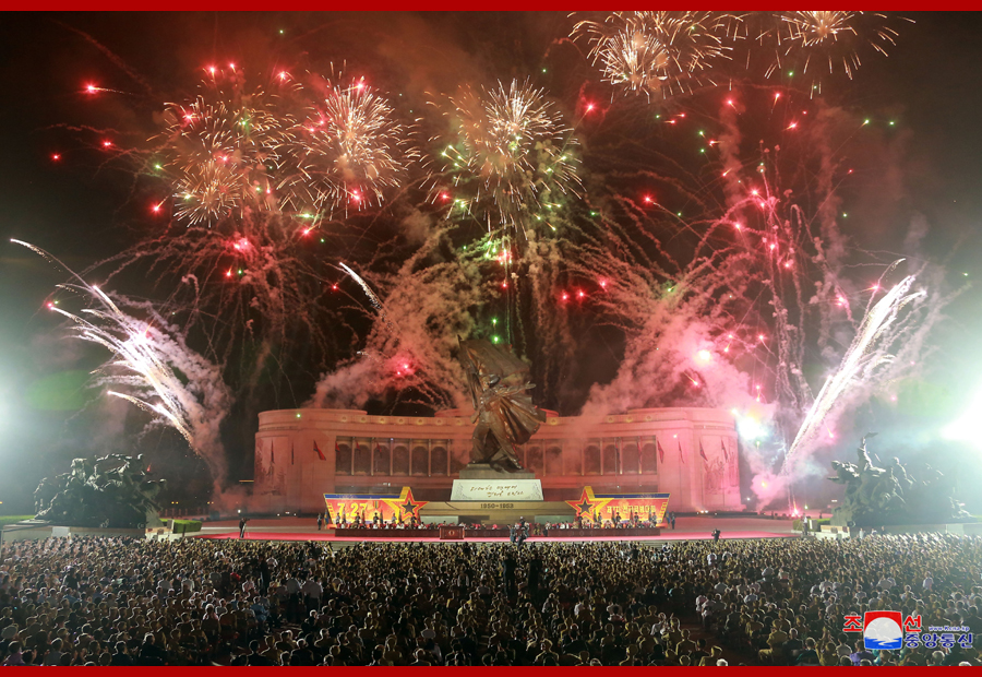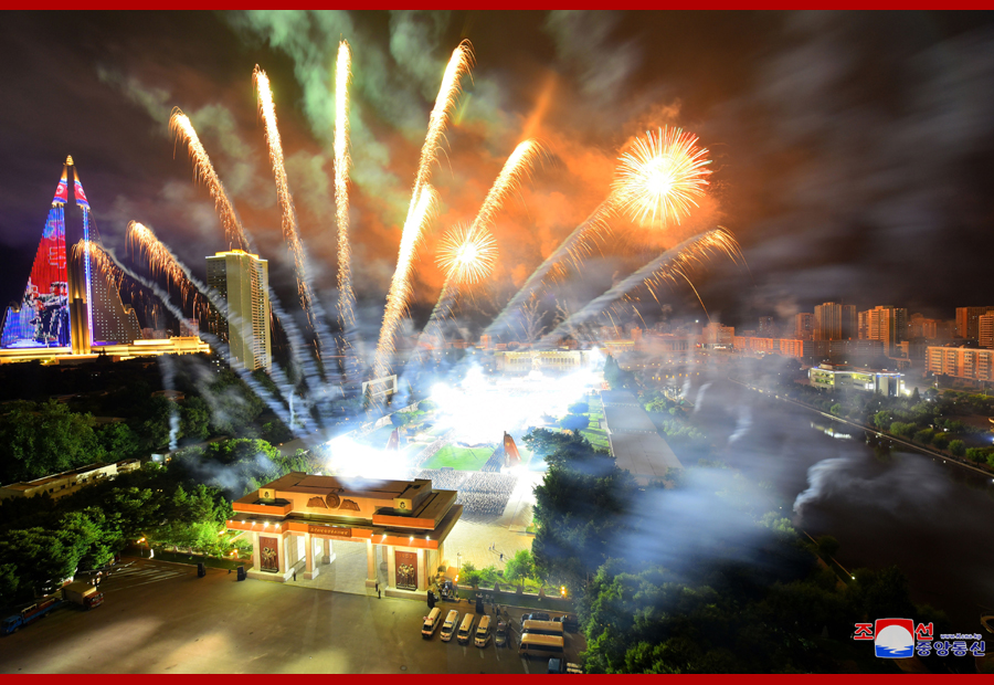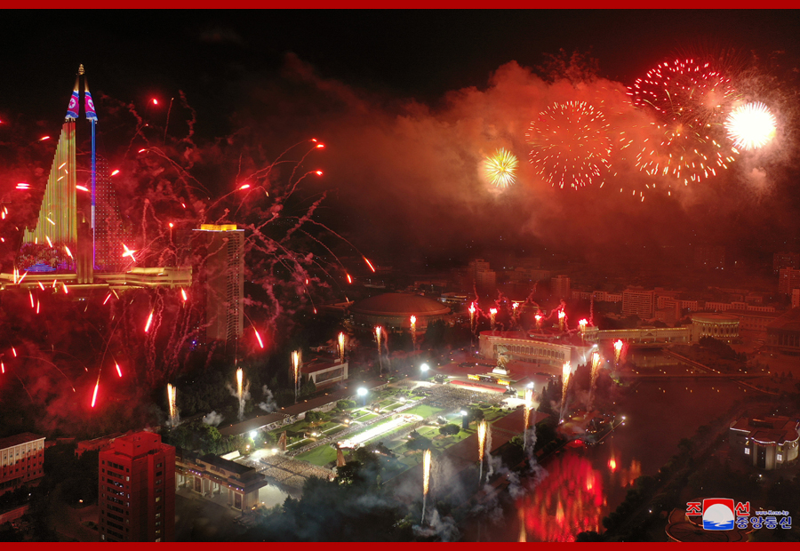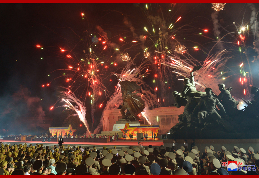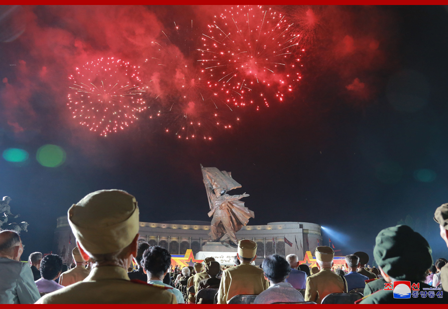 The moment, fireworks were displayed and all the participants raised stormy cheers of “Hurrah!” in great reverence for Kim Jong Un who is the symbol of the might of the ever-victorious WPK and dignified DPRK and a banner of all the victories and glory.