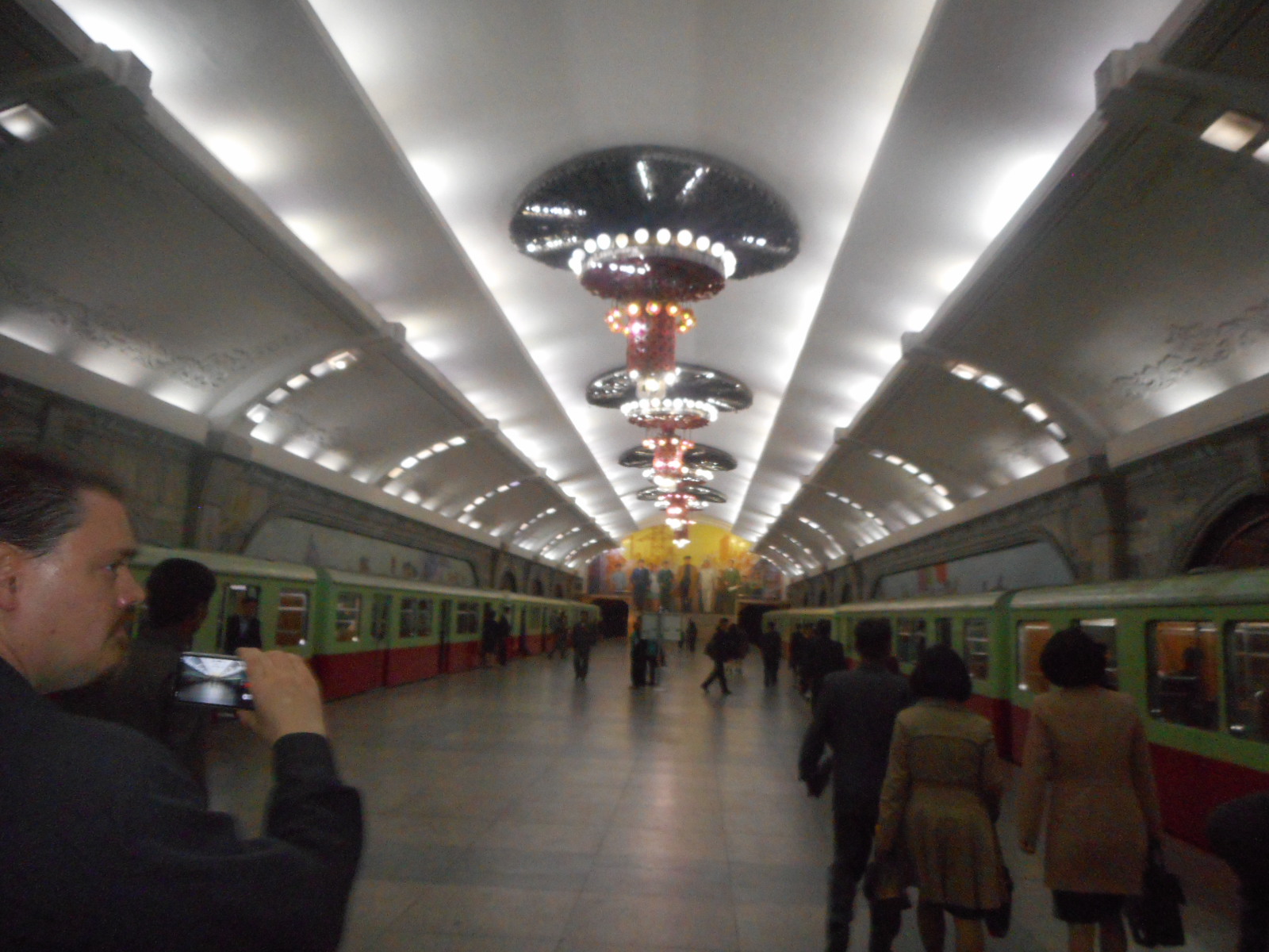 After getting off the escalator we walked through a spacious and wide tunnel .Again there was no advertising . It was spotlessly clean . Some people say that you can eat your lunch off the floor of the Pyongyang Metro !.There was no sign of graffiti or vandalism nor was there any hint of disorder or hooliganism .Soon we reached the platforms, However the word ‘platform’ really does not do justice to what was in front of us ! It was positively palatial , indeed an underground palace for Pyongyang’s commuters .I can remember first visiting the Pyongyang Metro in May 1992 and how the Portugese delegation let out a gasp when they saw the beautiful , cavern like station in front of them. The platform was very wide with the train tracks on either side with plenty of space for the passengers . There were finely polished marble columns and chandeliers . On the walls opposite the train tracks there were beautiful artistic murals. Again the floor was very clean. All this for just 3p ! .