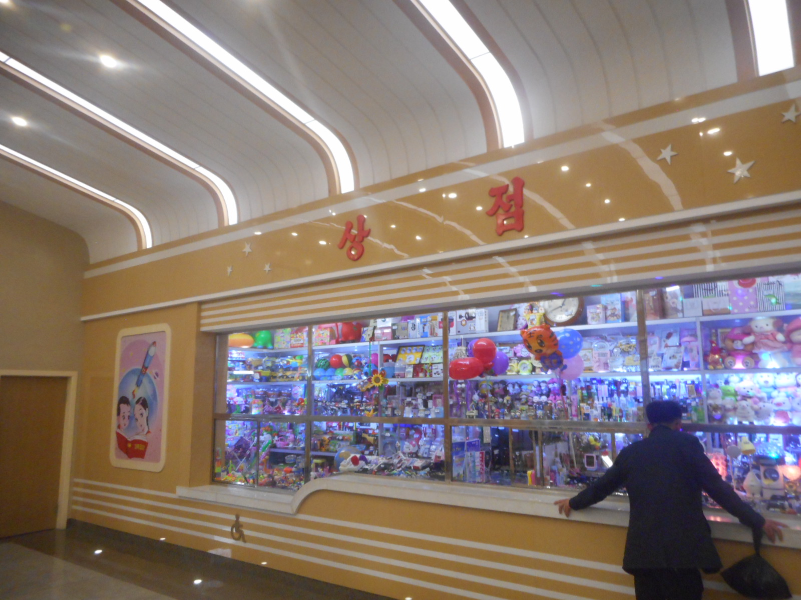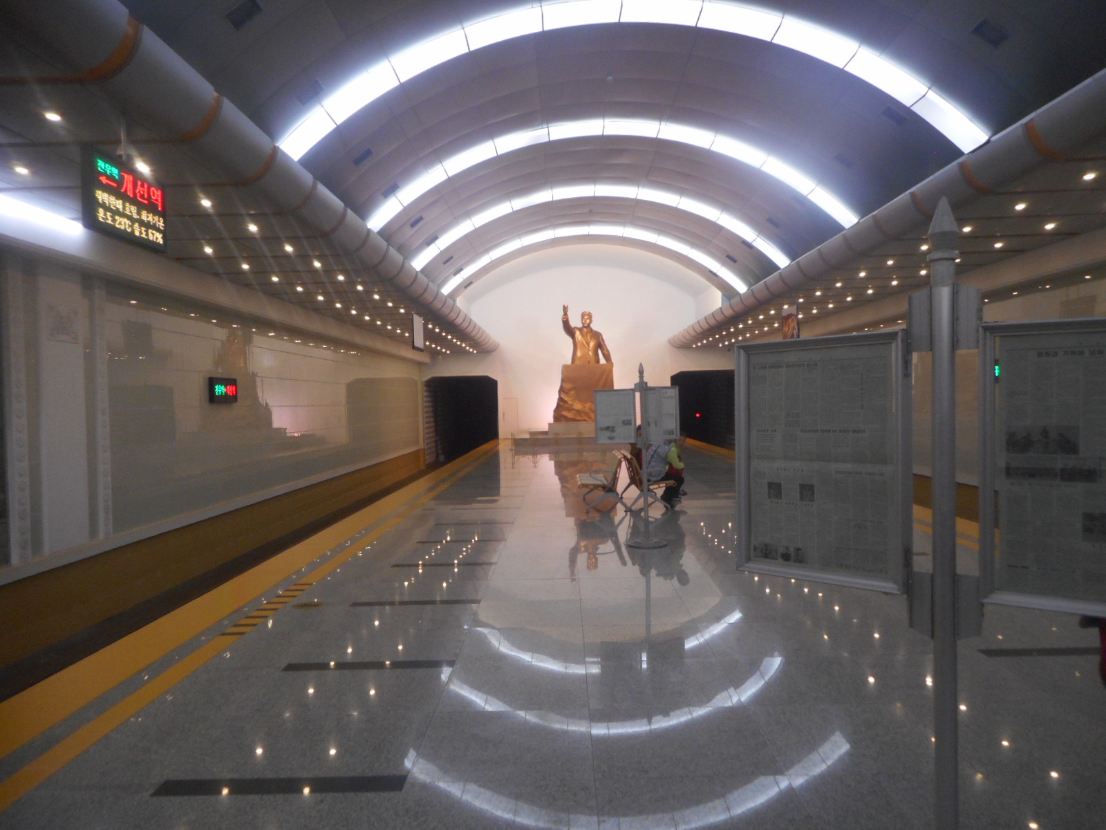 We traveled by train to Kaeson Station which is been reconstructed and modernized . The station has a statue of the great leader comrade KIM IL SUNG at one end of it . It also has the revolutionary murals . However the platform was new and there were electronic displays not only giving train information but also the current temperature in Pyongyang . It is noteworthy that the station had been modernised without fares being massively increased to pay for it , this is due to the people-orientated policy carried out by respected Marshal KIM JONG UN and the Workers’ Party of Korea . We ascended the escalators . The station had not only a ticket office but two shops one selling general products and the other was a very well stocked bookshop. We came out in the open air and found ourselves facing the magnificent Arch of Triumph .