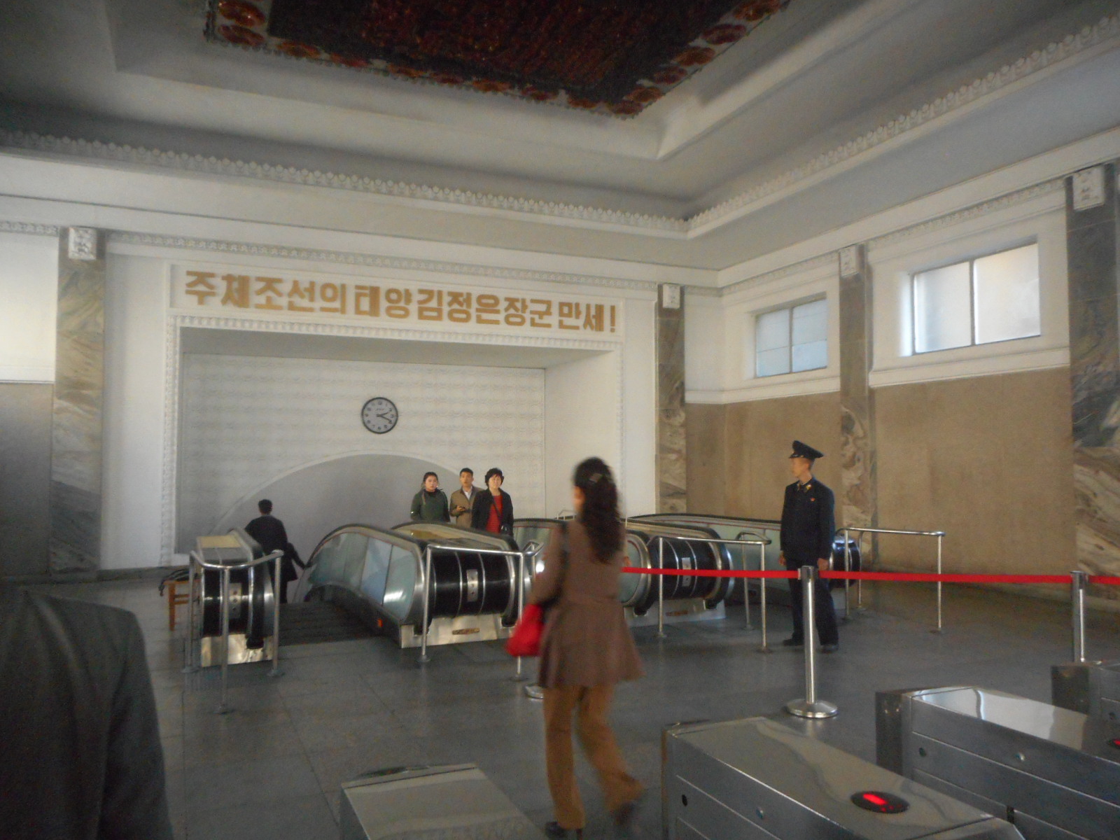 We descended to the underground railway . It was one of the longest escalators that I have ever been on. The walls plastered and painted white .They look clean and fresh . In the background DPRK revolutionary music was playing. In Pyongyang there is no rule about standing on the right and walking on the left. There was a complete absence of advertising. This was striking because in London we have grown all too accustomed to seeing adverts on the walls even as we just go down the escalators.Nowadays even the escalator stairs themselves have adverts on them ! We forget how crazy this .Usually the adverts are for things people do not really need or cannot afford or both !.