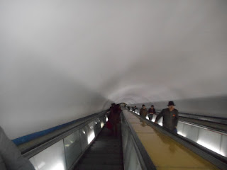 We stepped out of our minibus and into the station .The station was clean and orderly .It had ornate decorations adorning the wall and revolutionary slogan on the entrance to the escalator Unlike London there was no sign of homeless people begging outside the station or sleeping outside the station , recently I encountered a lot of homeless people outside of Charing Cross underground station. We passed through the barriers.