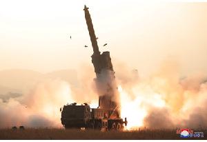 The perfection of the continuous fire system was verified through the test-fire to totally destroy with super-power the group target of the enemy and designated target area by surprise strike of the weapon system of super-large multiple rocket launchers. -0-