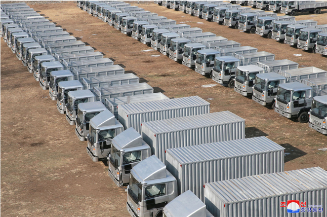 Looking at the new-type lorries standing in rows to fill up the spacious parking lot, he said with great satisfaction that they are the lorries made by Korean workers with their own efforts.