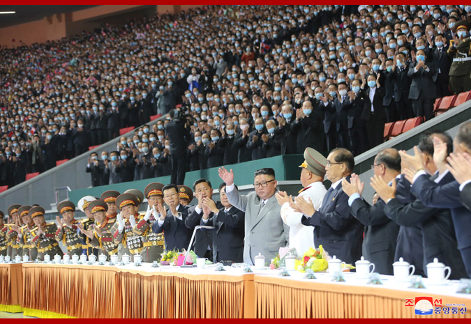 Among the audience were Choe Ryong Hae, Ri Pyong Chol, Kim Tok Hun and Pak Pong Ju, members of the Presidium of the Political Bureau of the Central Committee of the WPK, senior officials of the Party, government and military, the delegates to the celebrations of the 75th anniversary of the founding of the WPK, the participants in the military parade, viewers and Pyongyang citizens. -0-