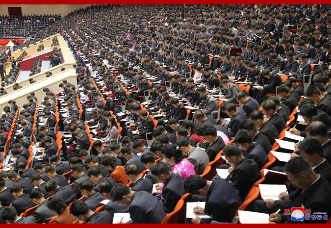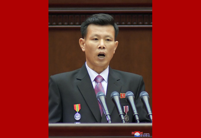 The report was followed by speeches by Pak Myong Gun, Party cell secretary of repair work-team of cement shop under the Sangwon Cement Complex, Ji Tong Gyu, Party cell secretary of Pak Thae Son-led Hero Work-team of the Yonggwang Pit of the Kumgol Mine, Pak Kwang Hyok, Party cell secretary of thermal insulation work-team No. 1 of thermal insulation shop under the Pyongyang Thermal Power Plant, Pak Kon Il, Party cell secretary of the repair work-team No. 2 of the steel shop No. 2 under the Kim Chaek Iron and Steel Complex, Ju Yong Bom, Party cell secretary of the electrolysis repair work-team of the water electrolysis shop under the Hungnam Fertilizer Complex, Pak Hyon Chol, secretary of branch Party committee and first Party cell secretary of the crop-raising team No. 10 of Kangson Co-op Farm in Chollima District, Kim Chun Song, first Party cell secretary of road supervision team of road repair and management corps under the Kaechon City Land and Environmental Conservation Department, Kim Song Nam, Party cell secretary of the Kim Jin Youth Shock Brigade under the Songnam Youth Coal Mine, Pak Yong Chol, Party cell secretary of fishing vessel “Tanphung 18-03” under the January 8 Fishery Station, Ri Ho Jun, first Party cell secretary of the North Hamgyong Provincial Public Prosecutors Office, Pak Song Chol, Party cell secretary of the work-team No. 13 under the Kosan Combined Fruit Farm, Song Jin Gyok, Party cell secretary of the candy work-team of the Kaesong City Children’s Foodstuff Factory, and Kim Jong Sik, Party cell secretary of the assembly shop under the Songchongang Electric Appliances Factory.