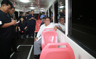 Kim Jong Un guiding the trial run of a new-model trolley bus in August 2018