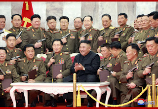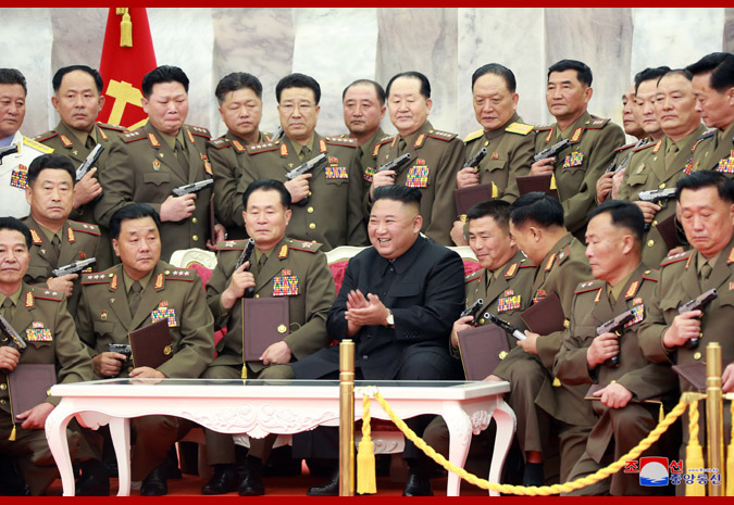 The commanding officers who were honored to receive the commemorative pistols directly from the Supreme Leader chanted in unison their pledge of loyalty to Kim Jong Un and the WPK Central Committee, holding close to them the weapons of the revolution with which they would share their destiny in the stern road of decisive battles.