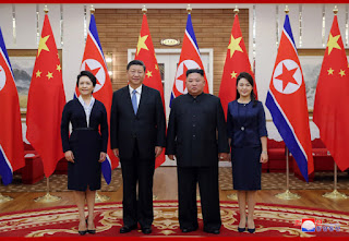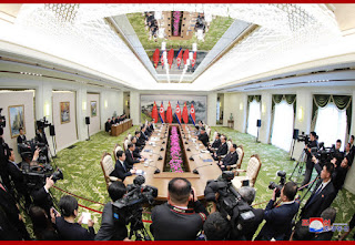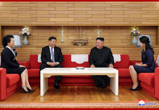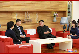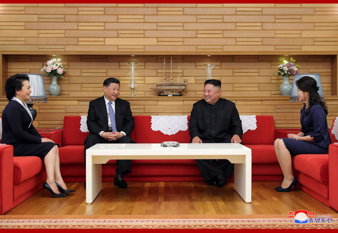 The Supreme Leader of the Party, state and armed forces Kim Jong Un and his wife Ri Sol Ju visited the Kumsusan State Guest House. They exchanged warm greetings and had a pleasant chat with Xi Jinping and his wife Peng Liyuan in a family atmosphere before having a photo taken against the background of the national flags of the two countries.
