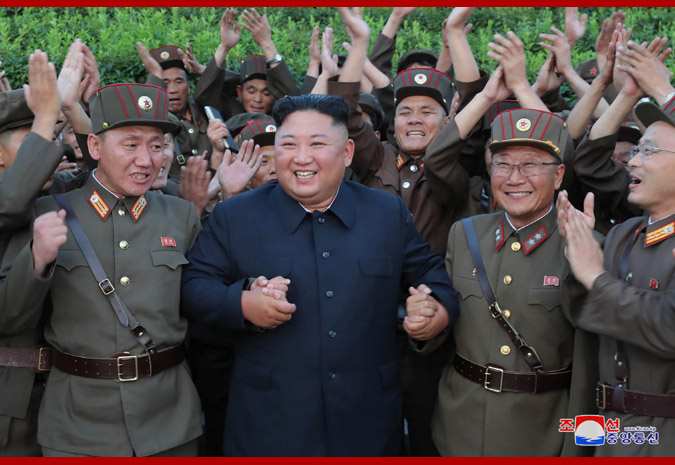 The Supreme Leader met the leading officials and scientists in the field of national defence science and workers in the field of munitions industry who successfully conducted the demonstration fire, and had a photo taken with them.